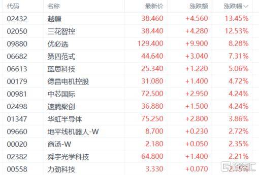 机器人概念股走强,三花智控涨超12%,优必选、第四范式、蓝思科技、德昌电机控股等跟涨。