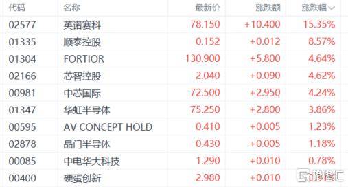 半导体股拉升,英诺赛科涨超15%,顺泰控股、芯智控股、中芯国际、华虹半导体等跟涨。