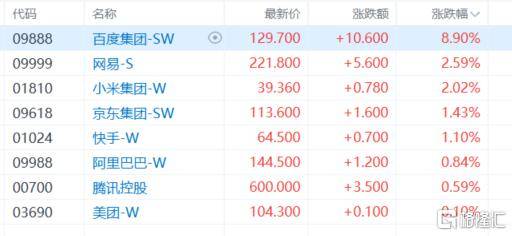 权重科技股集体上涨,百度涨近9%,网易、小米涨超2%,京东、快手、阿里巴巴、腾讯控股、美团跟涨。