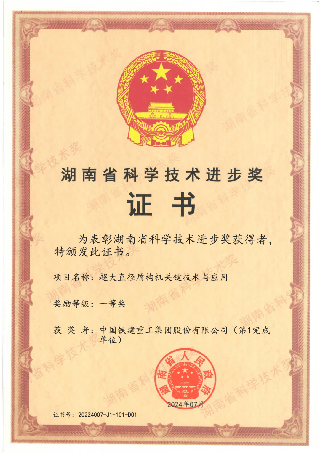 “超大直径盾构机关键技术与应用”项目荣获湖南省科技进步一等奖,推动国产超大直径盾构机产业化实现新突破。