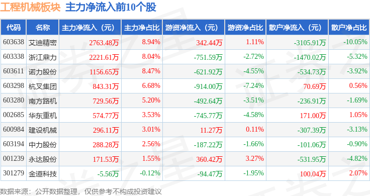 从资金流向上来看,当日工程机械板块主力资金净流出2.7亿元,游资资金净流出9285.21万元,散户资金净流入3.63亿元。工程机械板块个股资金流向见下表: