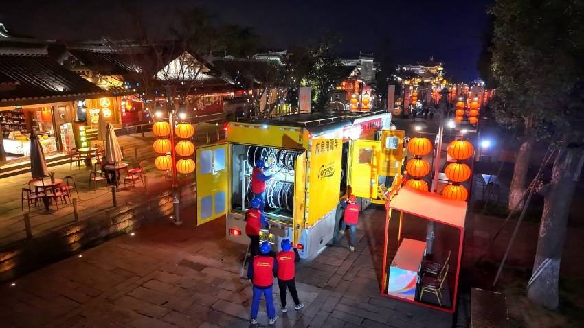 翠屏供电分公司党员服务队在李庄古镇接入发电车,为央视春晚李庄拍摄现场提供可靠后备电源保障。倪昶供图