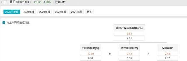 从三一中国的销售毛利率来看,除2022年略低外,其余年限均维持在了25%以上。但销售净利率下滑明显,自2020年15.97%至2022年低点6.64%,最新三季度在11.01%。